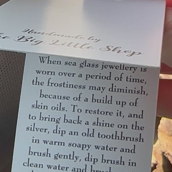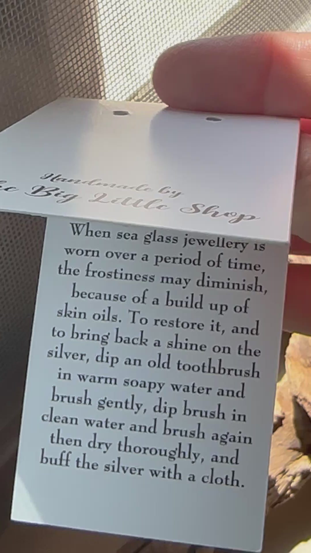 We are committed to sustainability in our products and packaging. This simple yet elegant earrings come with a small jewelry box, a polishing cloth, and a display card with a map where the sea glass was found and how to care for your silver jewelry tips.